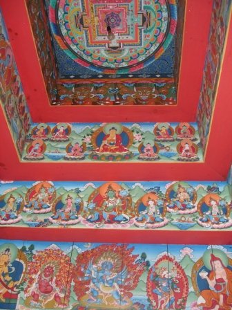 A földszinten a nagy “mani-korló” (imamalom) egy tonna papírtekercsen négyszázmillió mantrát tartalmaz. A sztupa négy sarkában felajánlást tartalmazó vázák vannak befalazva.